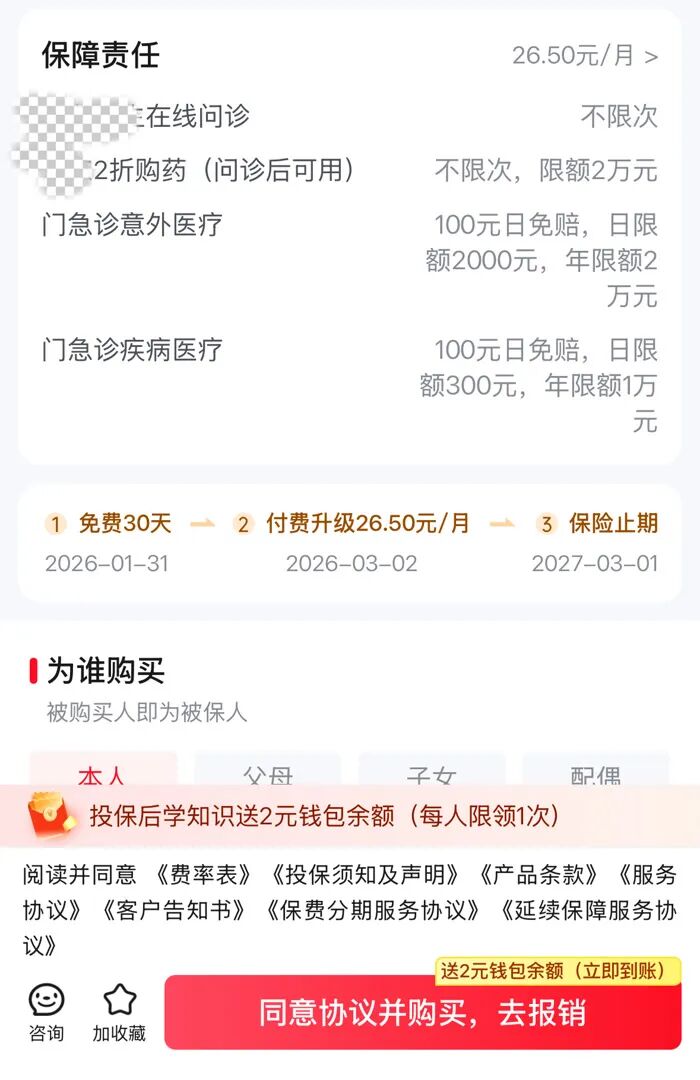 例如,记者随机进入某购物平台,其保险专区即弹出“门诊险”推荐,右下方出现“同意协议并购买,去报销,送2元钱包余额”的醒目红框。而点击的同时,即相当于对红框周边以极小字体排列出的“产品条款”“客户告知书”等七项协议表示知情同意。不但如此,使用者也很难注意到页面中还有接下来一年内“前30天免费,随后升级为26.5元/月”的信息,且延续保障服务也默认勾选为“立即开通”。用户很可能以为就是领了个红包,意识不到已经完成了投保。