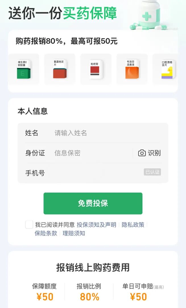然而在个人信息下方,有一个“免费投保”的按钮,显示其本质依然是一种保险。后面则以更细小的浅色字样标出投保须知及声明、保险条款、免责声明等近十项条款,只要在“我已阅读并同意”的框内打钩,这些条款即全部视作知情同意。